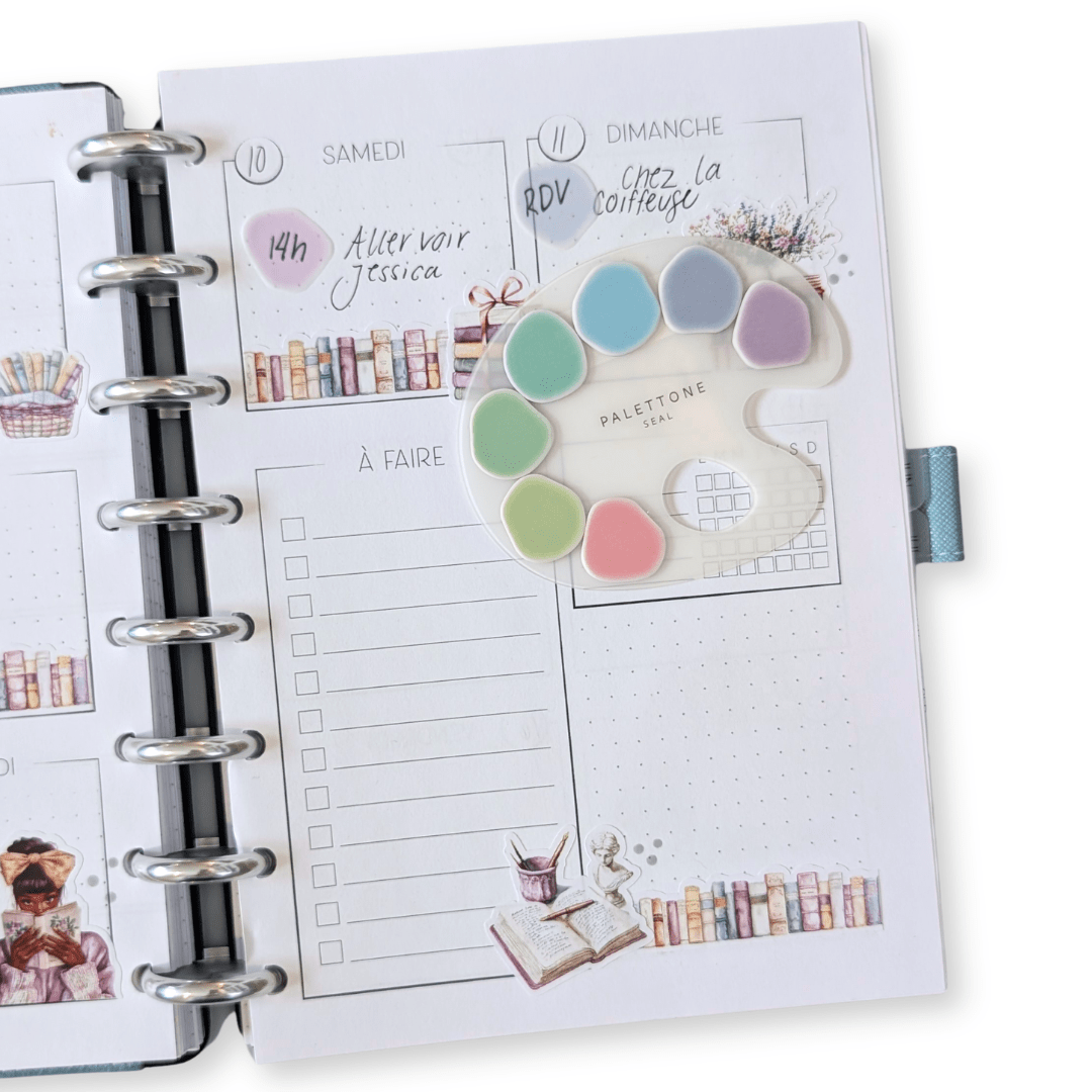 Les Palettone transforment tes pages en véritable palette de couleurs. Inspirés du monde artistique, ces autocollants te permettent d’ajouter facilement des touches harmonieuses et créatives à ton agenda, tout en gardant une cohérence visuelle douce et raffinée.