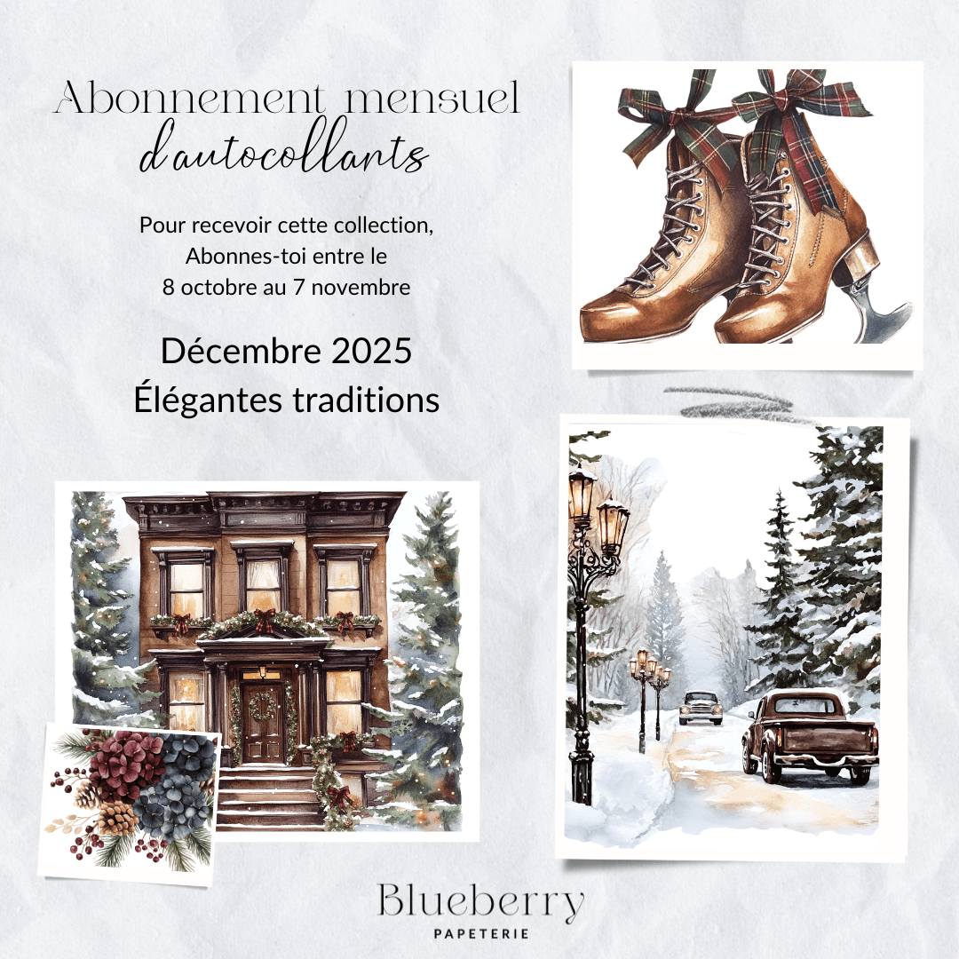 Nous envoyons les abonnements vers le 15 de chaque mois (sujet à changement selon les jours fériés). Tu recevras la collection pour planifier le mois qui s’en vient. Par exemple, tu recevras en janvier la collection de février.